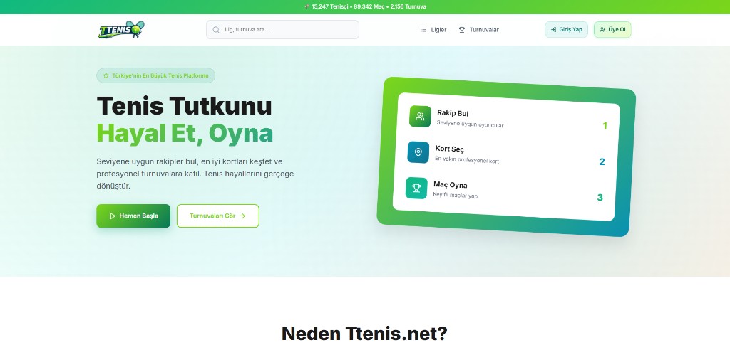 Türkiye'de tenis oynamak isteyen binlerce oyuncu, uygun rakip bulmakta ve kort rezervasyonu yapmakta ciddi güçlük çekiyordu. Ttenis.net, bu problemi kökten çözmek için tasarlandı.