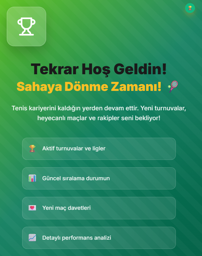 Seviye bazlı eşleştirme algoritması, gerçek zamanlı kort müsaitlik sistemi ve profesyonel turnuva yöneticisiyle platform, kısa sürede Türkiye'nin en büyük tenis topluluğu haline geldi.