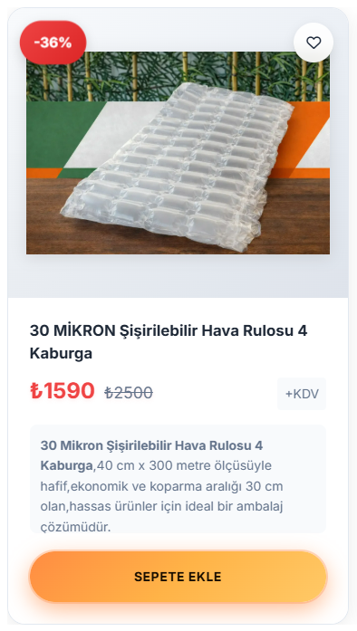 3 ana kategoride onlarca ürün, dinamik indirim gösterimi ve KDV yönetimi ile.